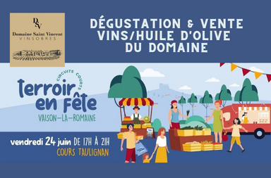 Le Domaine Saint Vincent participera à Terroirs en Fête, marché des terroirs de producteurs locaux, organisé par la ville de Vaison-la-Romaine, le Vendredi 24 Juin 2022 de 17h