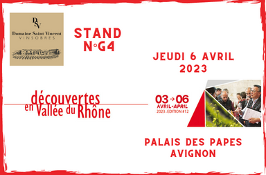 Le Domaine Saint Vincent participera au salon professionnel Découvertes en Vallée du Rhône Jeudi 6 Avril 2023 qui se tiendra à Avignon - Palais des Papes. Retrouvez-nous stand