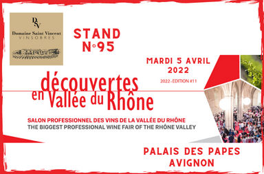 Le Domaine Saint Vincent participera au salon professionnel Découvertes en Vallée du Rhône Mardi 5 Avril 2022 qui se tiendra à Avignon – Palais des Papes. Retrouvez-nous