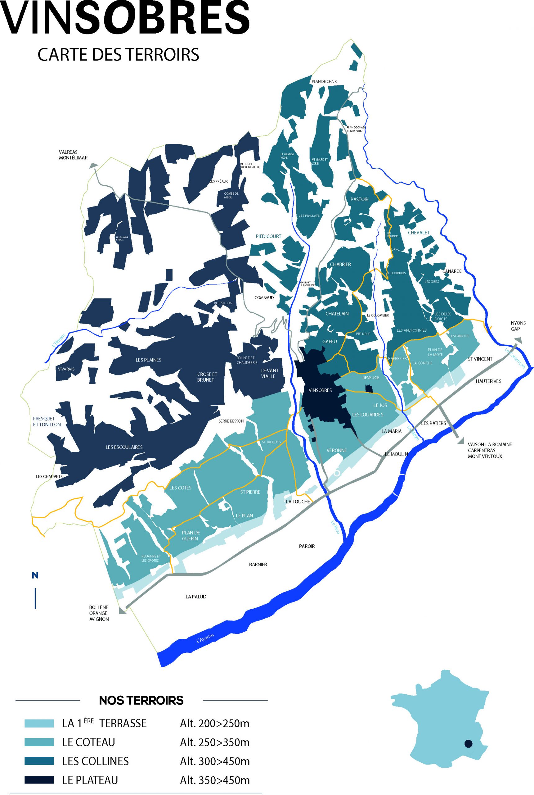 Orienté Nord Est / Sud-Ouest et culminant à plus de 500 mètres d’altitude, le terroir de collines de Vinsobres se caractérise par une grande diversité de sols. Leur potentialité et leur richesse apportent aux vins une grande complexité. Le terroir de Vinsobres se caractérise par son fort encépagement en Syrah ce qui confère au vin sa fraîcheur remarquable et son côté épicé.